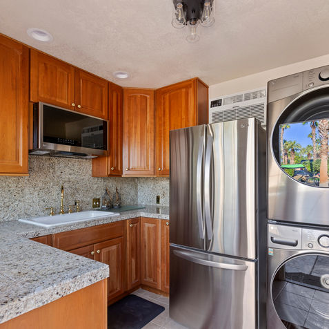 The separate Casita offers a range of modern amenities, including a full bathroom, shower, kitchen sink, and all-new appliances such as a refrigerator, washer/dryer, microwave, dishwasher, and an efficient A/C unit.