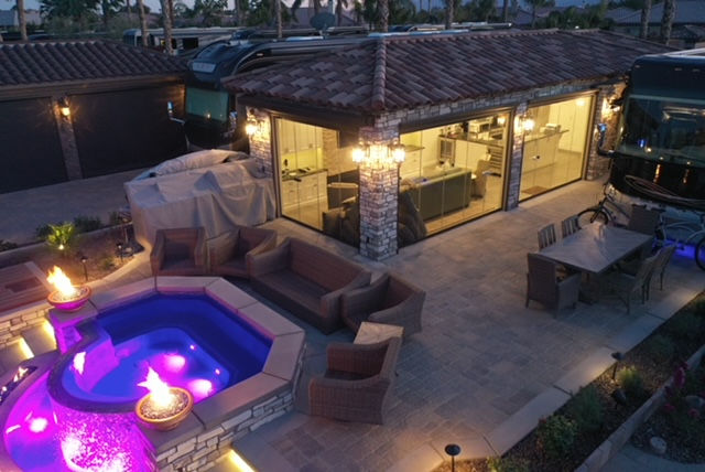 The Casita and shade structure are unified in one elegant building, featuring a beautiful bathroom and shower, a convenient Murphy bed, and a washer and dryer. The shade structure boasts all-glass walls that open completely, creating an airy, open environment perfect for indoor-outdoor living.