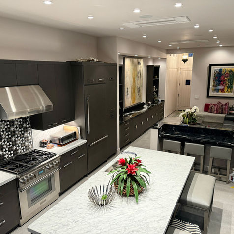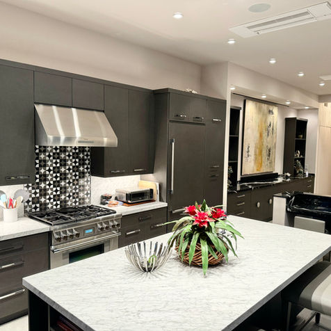 The gourmet kitchen is a chef's dream, equipped with Thermador professional series appliances, including a 36" pro dual-fuel range and hood, a 36" column refrigerator/freezer, and a 24" dishwasher. Additional features include an under-counter Sharp microwave drawer, two stainless steel prep sinks, and a large Carrera marble dining island with custom barstools.