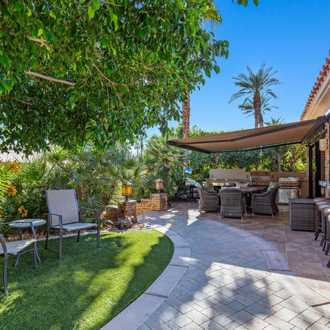 The upper patio features a custom-built BBQ island complete with a natural gas Twin Eagle BBQ, side burner, and electric griddle. A natural gas fireplace adds a cozy touch for cooler evenings. Extend the large awning with remote control to enjoy the warmth while watching outdoor TV.