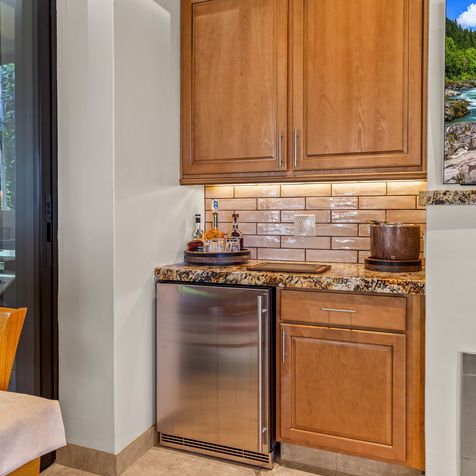 The living room offers a cozy and welcoming ambiance, featuring a comfortable couch that converts into a queen-size bed, a loveseat, and a dining table with chairs. The bar area includes a new U-Line under-counter fridge, and a natural gas log fireplace adds warmth beneath the mounted TV. Soft, under-cabinet lighting creates a soothing evening ambiance.