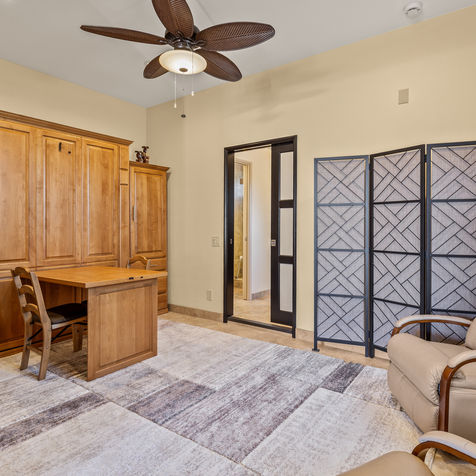 A recent room addition serves as a versatile office or bedroom, featuring a custom queen-size wall bed unit with integrated lighting, electrical outlets, wardrobe cabinets, drawers, and pull-out night tables. Adjacent to this space is the storage/laundry room, equipped with custom cabinetry, roll-out drawers, and LG ThinQ black stainless steel washer and dryer. Frosted glass pocket doors and floor-to-ceiling sliding doors offer privacy as desired.