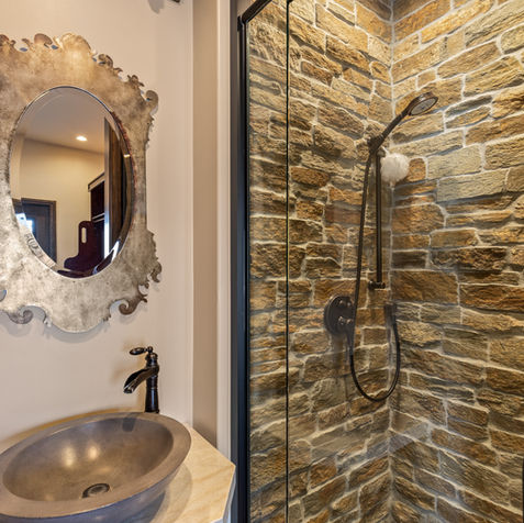 Spa-inspired bathroom, featuring beautifully matched stone finishes throughout.